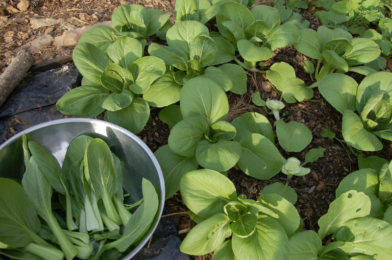 Things are growing and there has been more to harvest. The beans cropped well but now seem to be fading off, peas are going - norli turns out to be a miniature pea, tasty but a lot of work to pick. We have a good supply of lettuce, spinach, mizuna, bok choi, daikon, spring onions and coriander, with broccoli, chinese cabbage and stem lettuce looking close to ready. Trying to keep everything well mulched to protect soil from rain and wash in some organic matter, using a mix of pine needles and encina (holmoak) leaves.